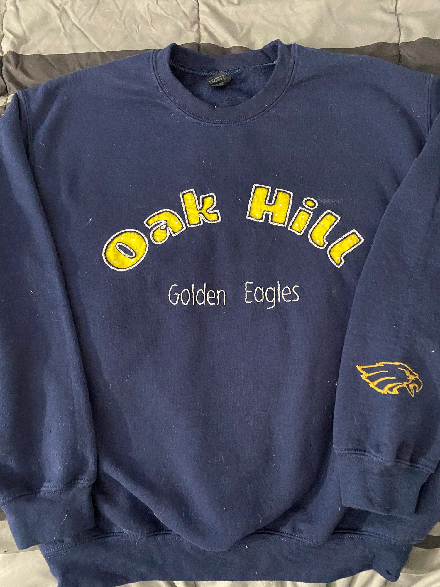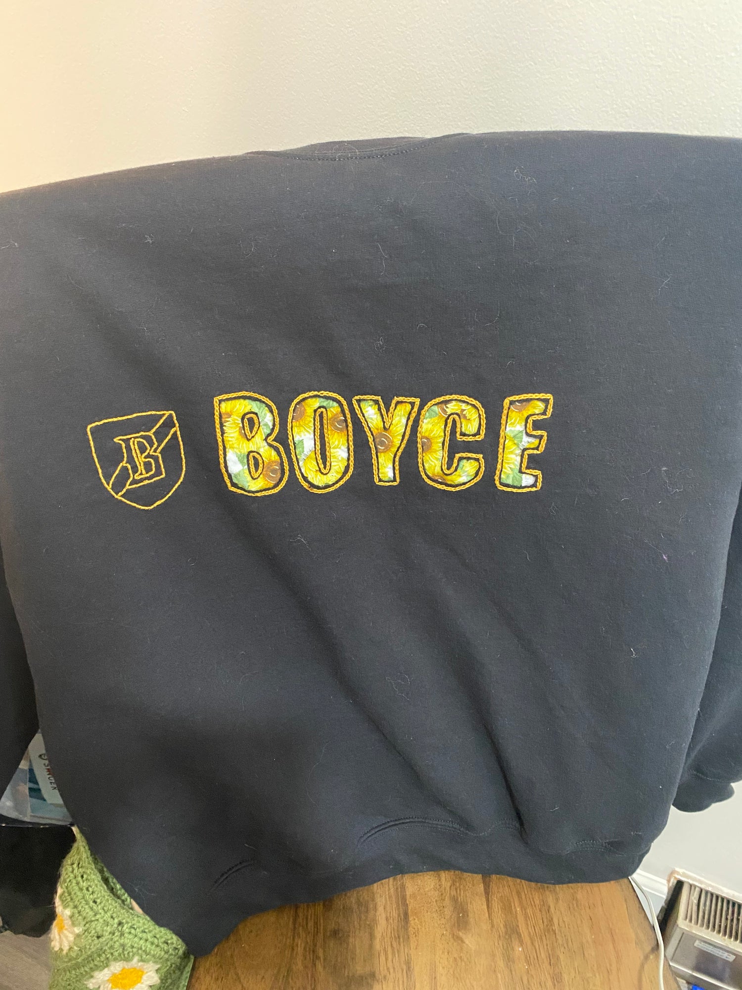 Reverse applique hand embroidered sweatshirt with Boyce College Emblem